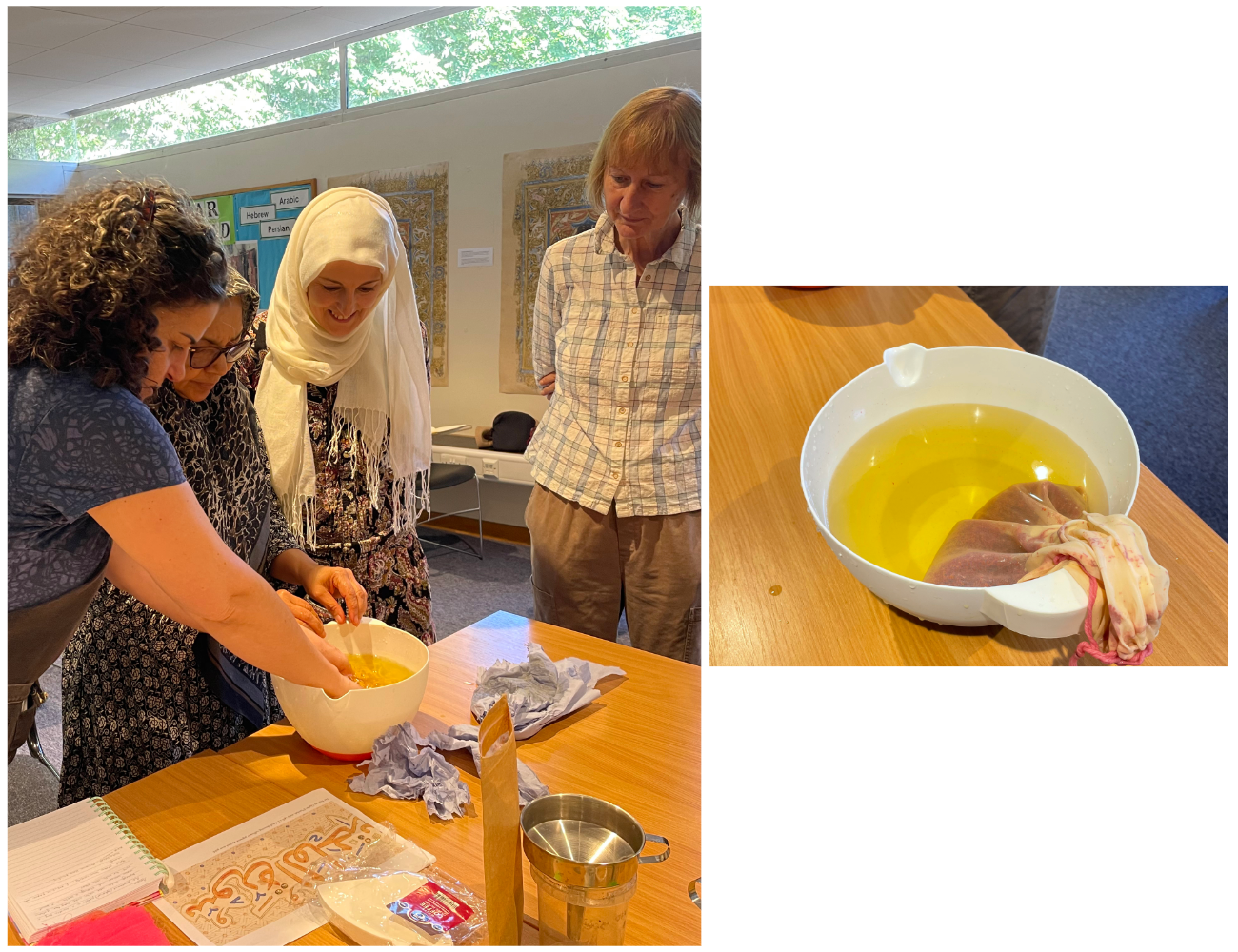 Next, we created a brownish-black ink made of oak galls (‘afṣ or kuḥl al-balūṭ). These small round balls grow on branches and twigs of oak trees and are concentrated with tannin. After crushing and boiling the oak galls with gum arabic, we added vitriol that magically resulted in a beautiful black ink for us to play with. For pomegranate (rumān) ink, we created the pigment using dried pomegranates with a pinch of alum, roughly following the recipe of the 13th C Andalusian master, Abu Bakr Muhammad al-Qalalusi. Pomegranate is one of the plants mentioned in the Qur’an and we have seen stylized depictions of the fruit in some ceramics at the Fitzwilliam Museum as well. We also experimented with one final ink, saffron (za‘afrān in Arabic; crocus sativus) for a bright yellow colour, stemming from the recipe book of al-Mu’izz ibn Badis (d. 1062 CE) titled ‘Umdat al-Kuttāb (Book of the Staff of the Scribes).