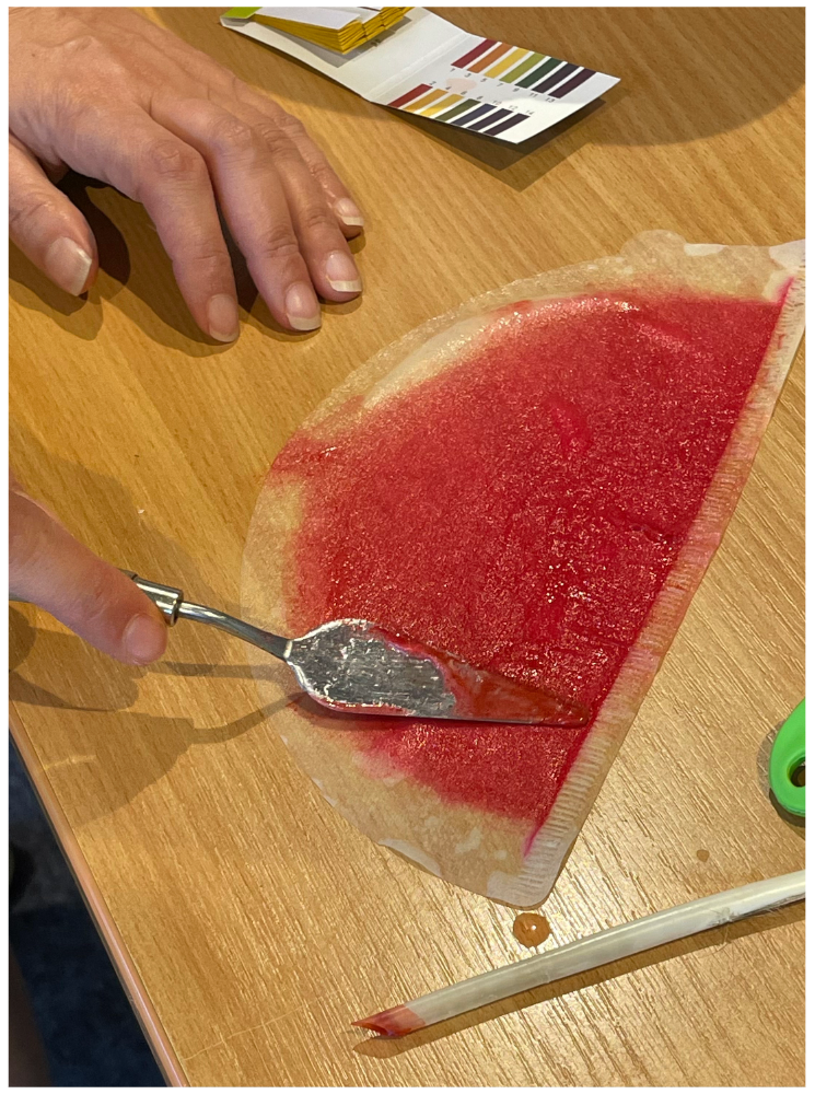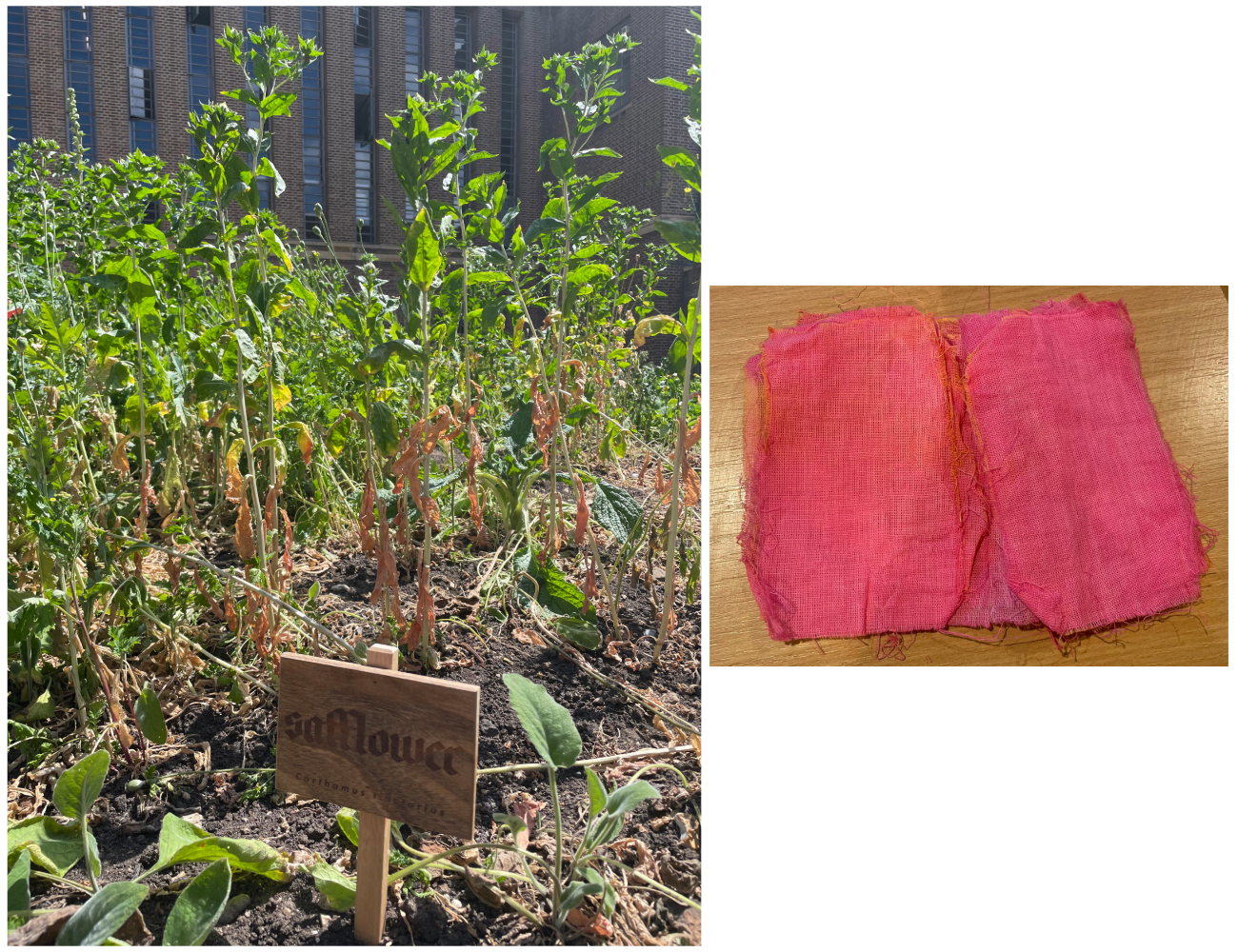 With Joumana, we created four plant-based inks that were incorporated in Islamic manuscripts: safflower, saffron, pomegranate, and oak gall. We started with safflower as creating this ink took the longest time. We had an opportunity to see the safflower plant in the UL dye garden last week, so it was particularly exciting to work with this plant. Safflower (al-‘uṣfur in Arabic; carthumus tinctorius in Latin) produces a beautiful reddish color when used on a cotton textile. On silk, the garment will often retain the yellow, unless the safflower dye has undergone the lengthy extraction process. In our short time, we attempted to work through this extraction, squeezing the yellow from the petals in order to attain the coveted red hue, the “jewel” of the safflower. After a process of filtration, we were all dazzled by the pinkish red that we extracted in a few short hours. This pigment was used as part of the illumination of the monumental Qur’an of Sultan Baybars produced in Cairo between 704-5 AH/1304-6 AD during the Mamluk period.