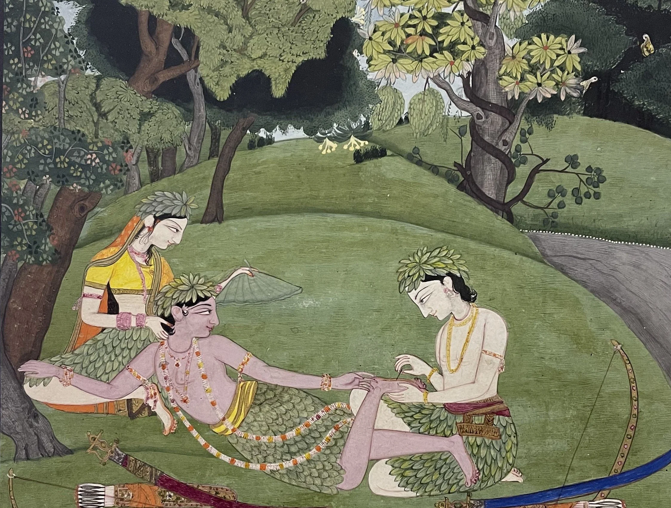 Rama reclining against Sita, while his brother Lakshmana draws a thorn from his foot