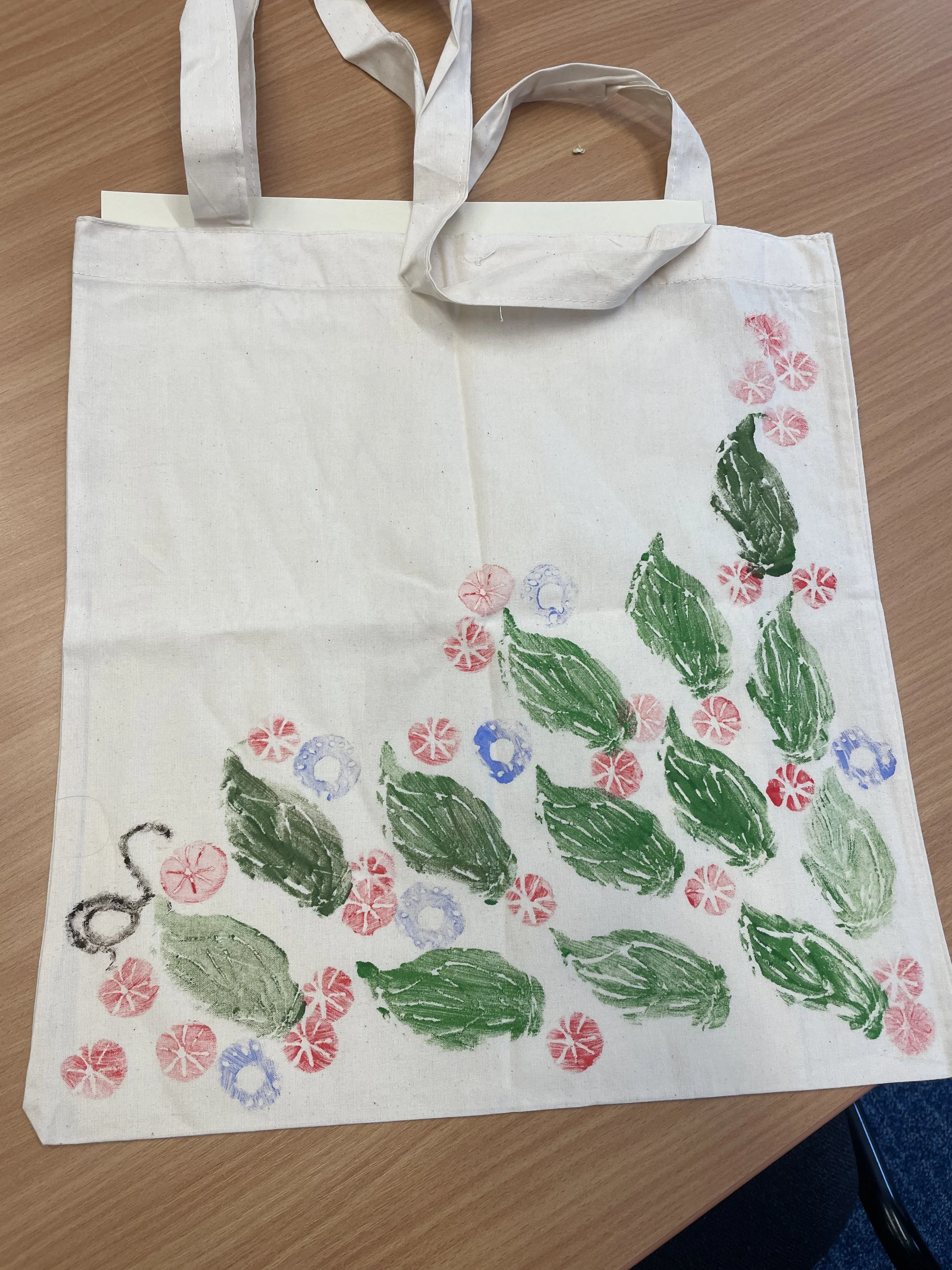 Block printing on fabricA workshop with Sa’adiah Khan Participant block print explorations on tote bags